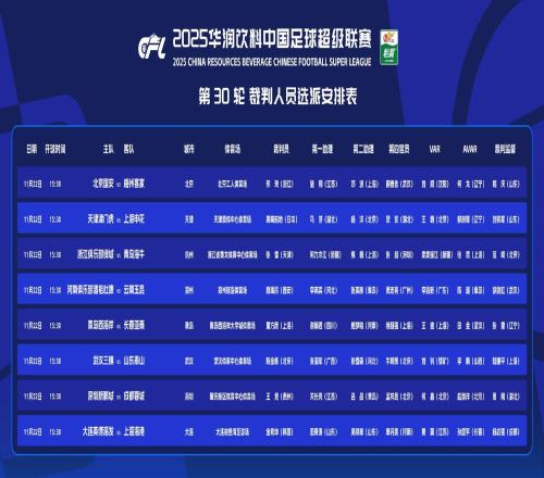 北京时间11月22日,中超联赛第30轮8场比赛将于今天下午同时开打。刚刚,本场比赛裁判选派结果出炉,2场争冠关键战...