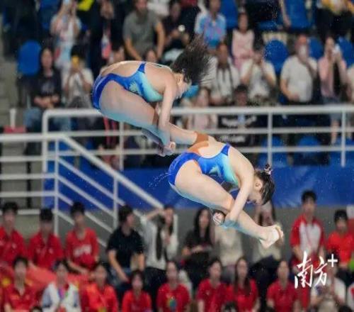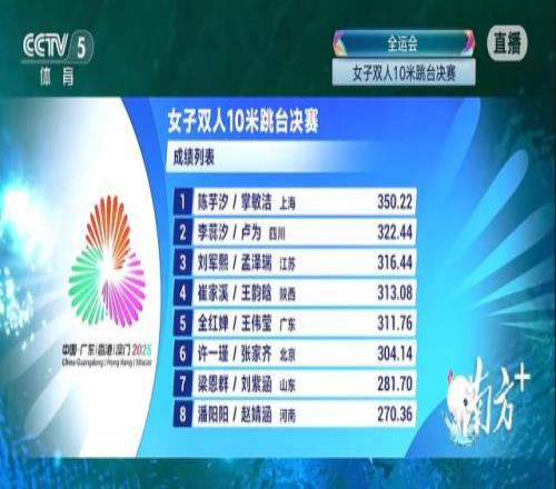 陈芋汐掌敏洁获得十五运会跳水女子双人10米台金牌,全红婵王伟莹获得第五名