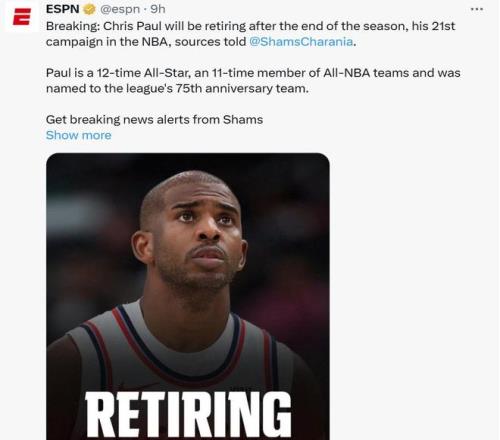 根据ESPN名记Shams报道,在对阵家乡球队黄蜂队之前,保罗通过社媒宣布将在本赛季结束后退役,开启最后一舞退役巡演,NBA生涯止步21个赛季。