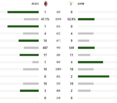 本场比赛AC米兰虽然是主场作战,但是表现并不好,上半场更是没有一脚中目标的射门,靠着迈尼昂的神勇发挥,才没有陷入落后的不利处境之中,不过下半场莱奥爆发,打入全场唯一进球,帮助AC米兰1-0复仇蓝鹰拉齐奥。